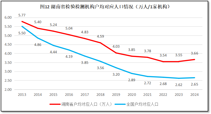 再来看湖南地区检验检测机构户均对应服务的人口情况。2024年末,湖南省常住人口6539万人,检验检测机构户均服务人口3.66万人,比全国平均数2.65万人高出10100人,排名全国第2位,较2023年度排名提升1位。可见,相对于湖南省人口数量来说,当地的检验检测机构数量显得并不多。过去12年,湖南省检验检测机构户均对应的人口数量与全国的情况进行比较,如图12所示。